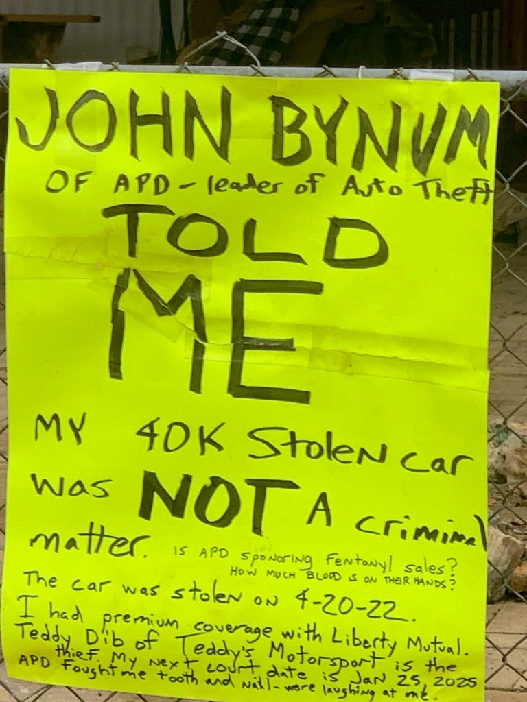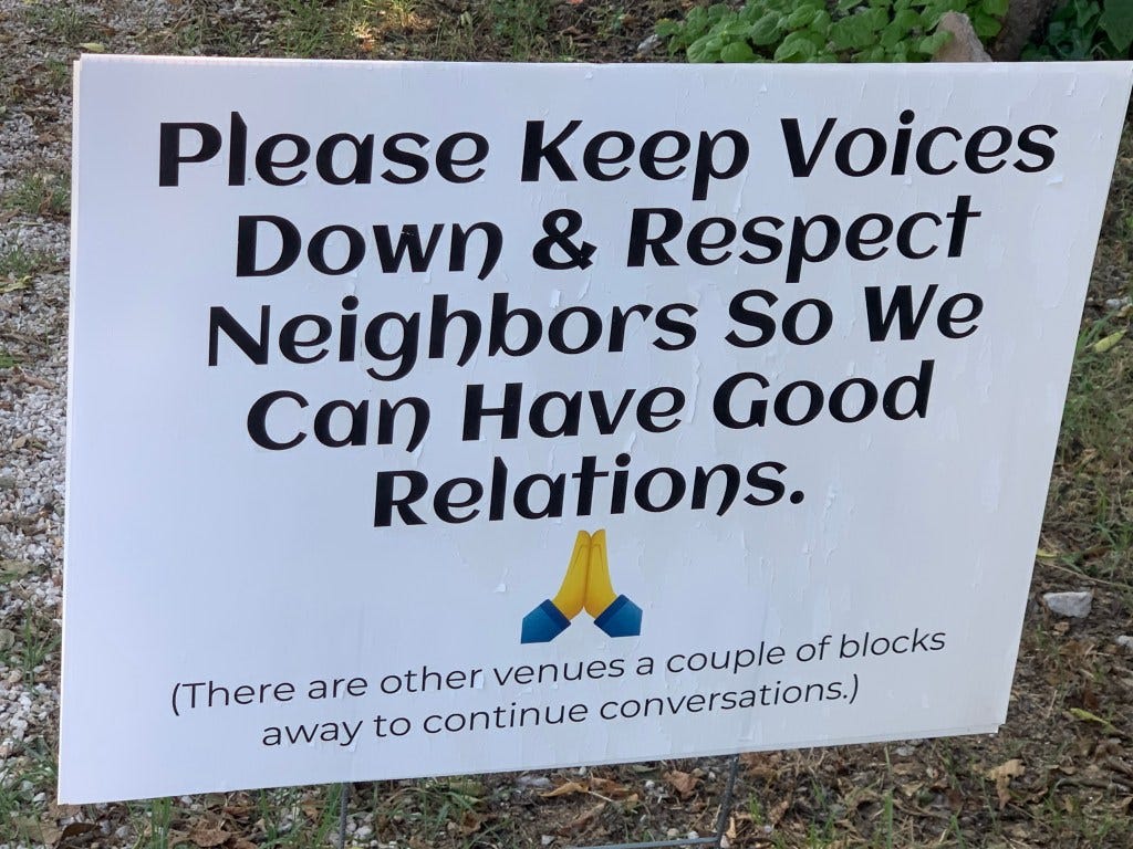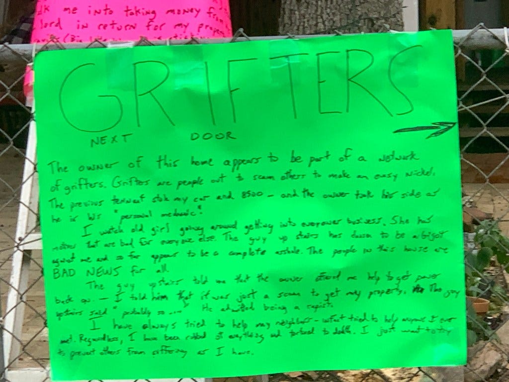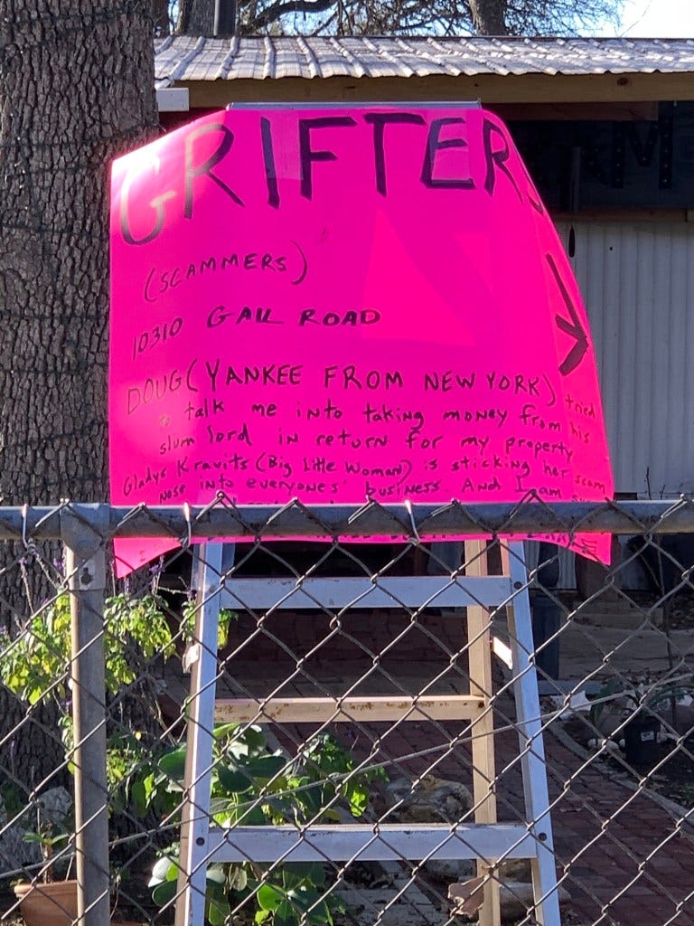 Two doors down from my house, pointing at the house in between us (and directed, I believe, not primarily at the house’s current resident, who I know, but her landlord, who I don’t.) Pink sign reads, in part: “DOUG (YANKEE FROM NEW YORK) tried to talk me into taking money from his slum lord in return for my property Gladys Kravits (Big Little woman) is sticking her scam nose in everyone’s business. And I am sure she has been undermining me. I live by THE CASTLE DOCTRINE ☆☆☆☆☆ ☰” (Gladys Kravitz was Samantha and Darren’s neighbor on Bewitched, if you’re not up on vintage TV trivia.)