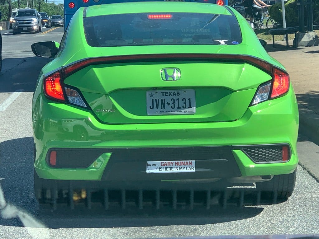 Further north on Manchaca, green Honda Civic in front of my car. Possibly the funniest bumper sticker I’ve seen since I moved to Austin. Though how many people get it, I wonder? The song is 46 years old!