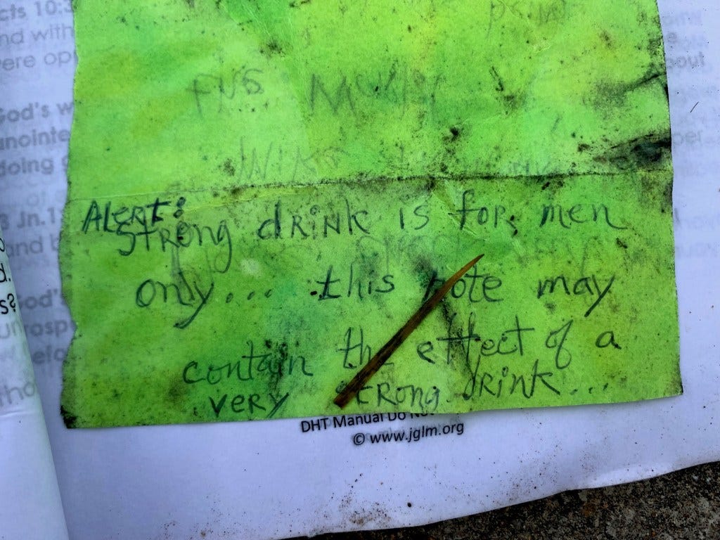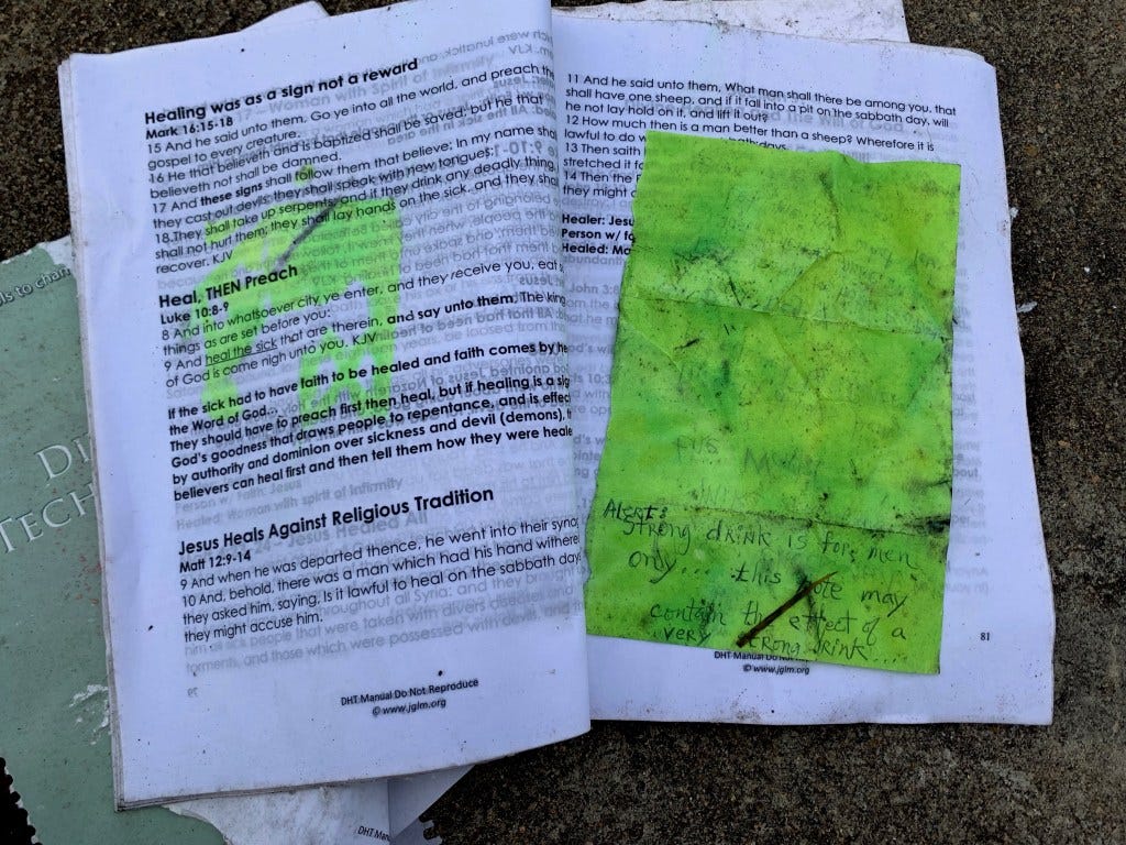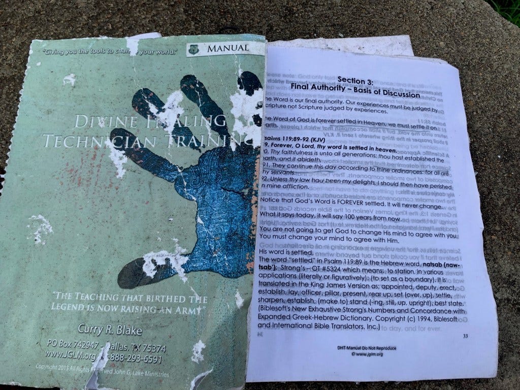 Divine Healing Technician Training manual, found (if I remember right) atop a sewer grate near Southwest Christian church, corner of Old Manchaca and Lynnbrook. Written note inside: “Alert: Strong drink is for men only…this note may contain the effect of a very strong drink.” Excerpt from text: “You are not going to get God to change His mind to agree with you. You must change your mind to agree with him.”