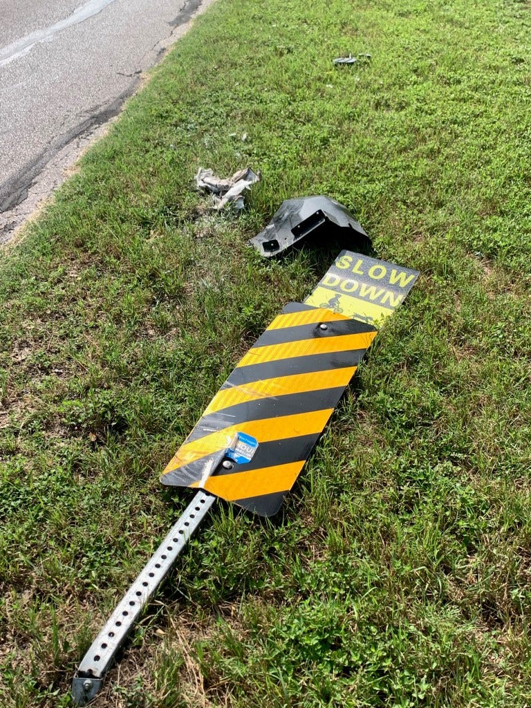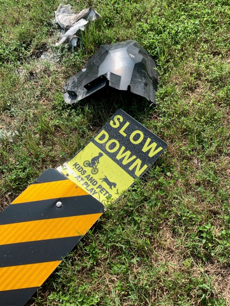 Lying in someone’s lawn at corner of Gail and Womack, apparently having been knocked over by a vehicle that may or may not have left a piece of its body behind: “SLOW DOWN / KIDS AND PETS AT PLAY”. Hey, at least it didn’t leave a piece of their bodies behind. I hope.