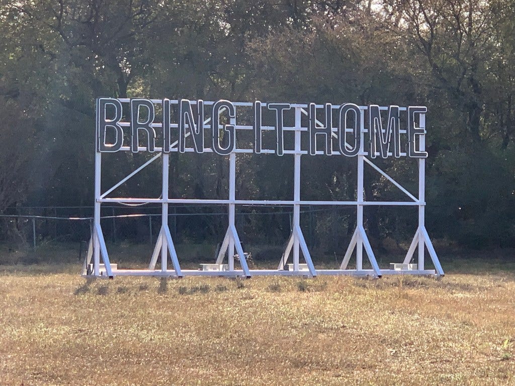 In the middle of a vacant lot field on Oak Valley, close and parallel to the treeline. Maybe 12 feet high, 55 feet wide (sorry I didn’t bring a tape measure and stink at estimating distances), five feet deep, with four-foot-tall letters, plus thick electrical cords hooked to the bottom. Retired from high school football, is my guess. Been there for several months, and I still have no idea what exactly is being brought home.