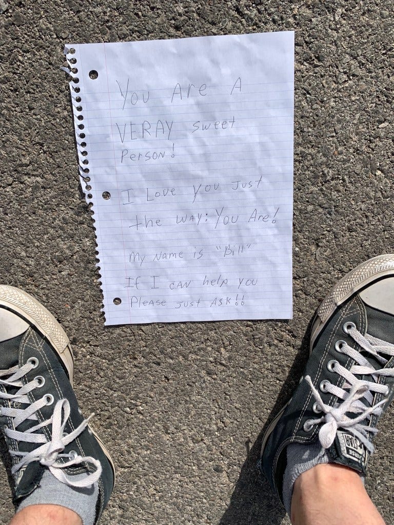 Sheet of spiral-notebook paper, in middle of street at Casata micro-homes complex: “You Are A VERAY sweet Person! I love you just the way: You Are! My name is ‘Bill’ If I can help you please just ask!!” Billy Joel, you probably remember, actually sang “Just the Way You Are.”