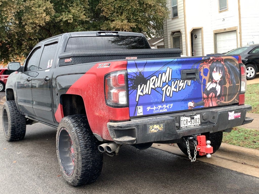 Out on the road today I saw an anime poster on a pickup truck. Was surprised to see those two consumer demographics (subcultures?) overlap, though somebody suggested that their common denominator might well be “porn.” Saddle Creek neighborhood on Old Manchaca east of Manchaca, near Cove Apartments and the Lower 48 bar.