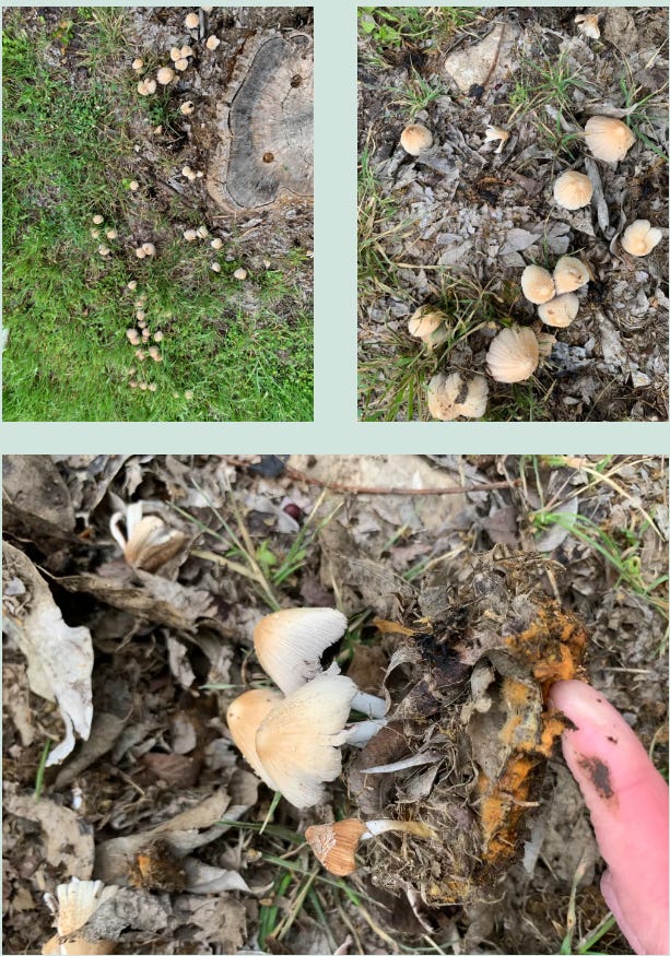 Tan center, whitening toward their edges. Delicate little umbrella-like things. Could be but probably isn’t: Coprinus plicatilis, seemingly an alias of Parasola plicatillis, the pleated inkcap (“Small mushrooms have a brown center that soon turns silvery gray, and radial lines form from the margin almost to the cap center. Thus they look like silvery gray parasols on the ground. There is almost no substance to the cap…Troops of this mushroom may number into the hundreds, springing up overnight and gone by noon on a dry, sunny day” — Metzler on Corpinus); Marasmiellus ramealis aka Twig Mummy-Cap (“This tiny agaric always grows in abundance along dead twigs….It tolerates fairly dry conditions” – Læssøe.) Is that orange stuff the mycelium?