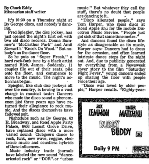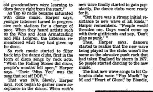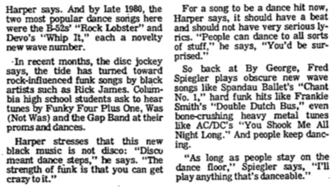 Posted more for socio-historical interest, than because it’s any good: A confusing college-daily-paper trend piece, conflating at least two different kinds of music (am I talking about new wave or talking about funk? why can’t I make up my mind?) and tossing in a questionable anti-disco subtext to make things even more disingenuous. Rap and the Stones and even AC/DC figure in somewhere, too. Then again, pretty sure I first heard of “dance oriented rock” while reading Robert Christgau’s 1979 Pazz & Jop essay, at the beginning of 1980: “White people (dancing to the B-52s) were once again catching up with the black music of an earlier time, in this case James Brown funk. Bizzers began talking about DOR– dance-oriented rock –instead of disco, and a real punk-disco fusion was achieved by two notable records, which oddly enough ended up on top of the first P&JCP singles chart: Ian Dury’s ‘Hit Me With Your Rhythm Stick’/’Reasons to Be Cheerful, Pt. 3’ and M’s ‘Pop Muzik.” So maybe new wave and funk were the same??