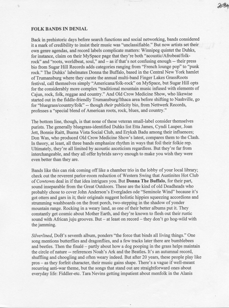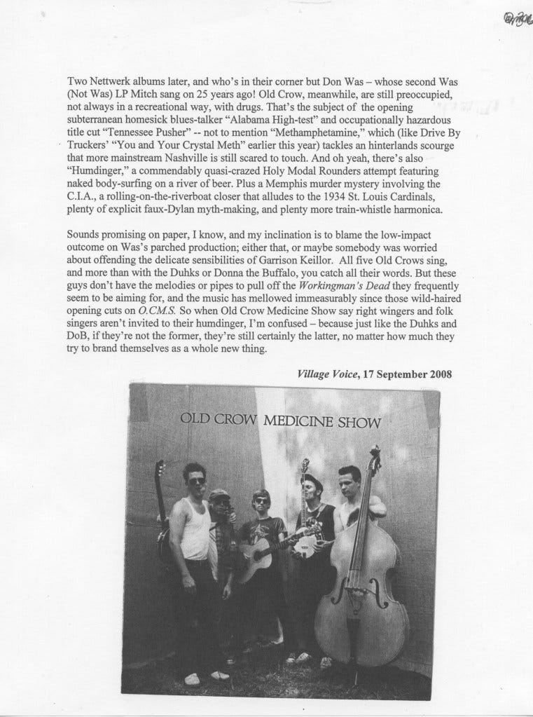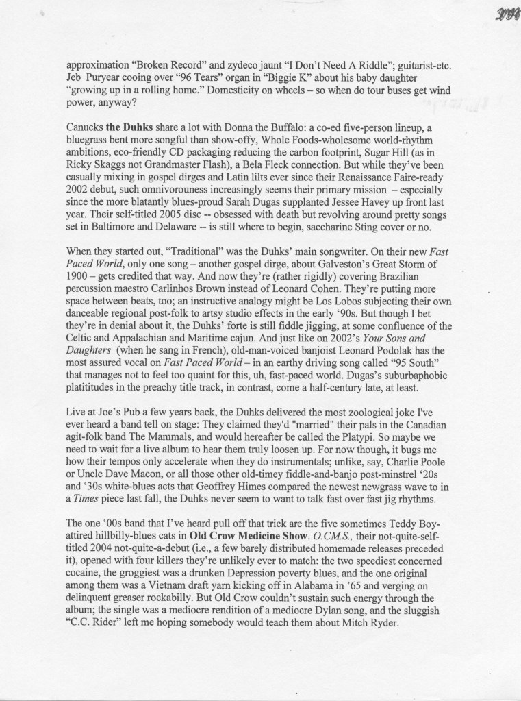 Haven’t kept up with any of these bands since — My Americana attention span is not long. Not even sure if Darius Rucker’s (i.e., the Artist formerly known as Hootie’s) cover of Old Crow Medicine Show’s fleshing out of Dylan’s “Wagon Wheel” made Ketch Secor a rich man. Apparently a lot of it went back to Big Bill Broonzy anyway.
