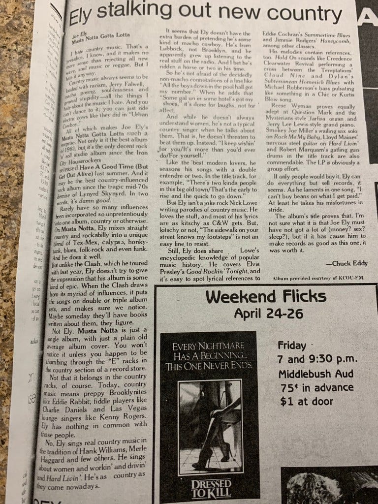At times unintentionally hilarious review for my college weekly, thanks primarily to my embarrassing ignorance about country music involving assumptions many city slickers no doubt share — and which certainly have at least some small basis in truth, even four decades later. My logic contradicts itself, partly resting on my deciding I disliked country because it, uh, wasn’t country enough — hence my valuing Ely’s apparent authenticity as a legitimate Lubbockite who has “ridden a horse or two.”