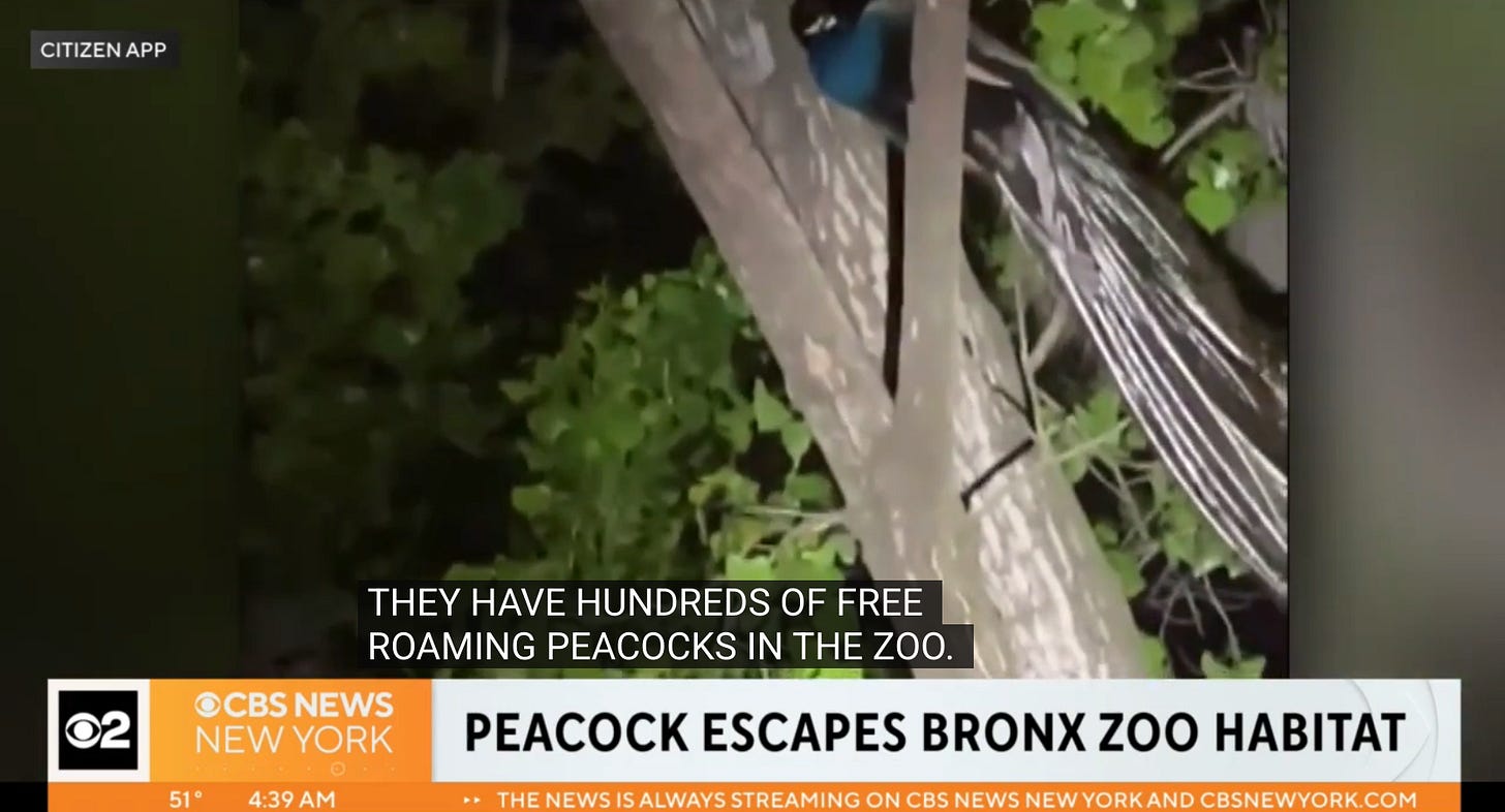 And obviously, the NYTimes is just one newspaper out of thousands. In 2018, four peacocks went on the lam from the Philadelphia zoo and hiked down I-76. In 2014, a peacock ran away from a zoo in suburban Chicago in the middle of winter and, unsurprisingly, froze to death. So okay, maybe more man biting dog than dog biting man. But just barely.
