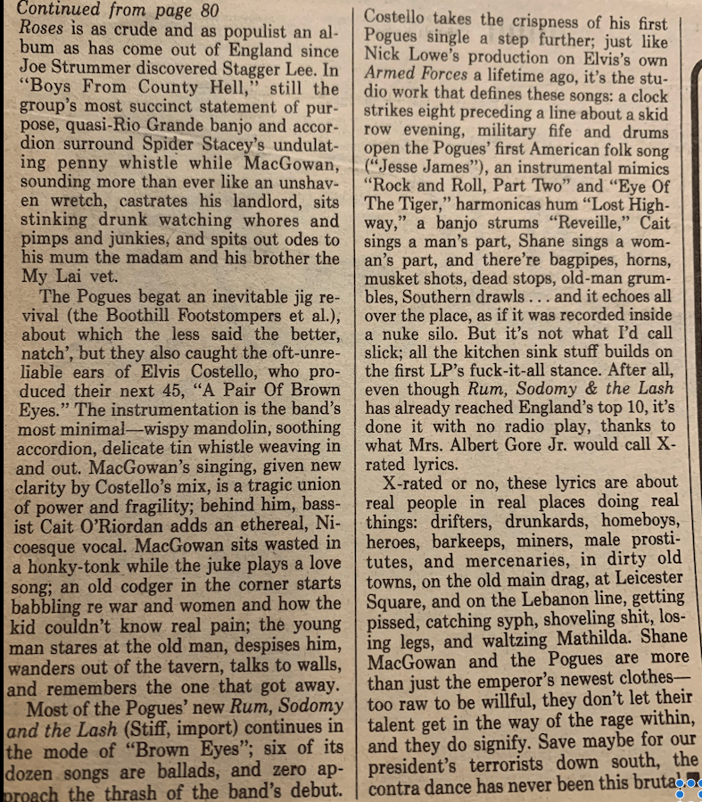 Not sure whether Bob Mack ever noticed, but I eventually wound up liking Budgie (and Rush too), around the time Christgau accepted Motörhead as token metal heroes. Mack (the same Bob Mack who wound up editing Grand Royal in the mid ’90s and getting Beastie Boys shoutouts and dying just a couple weeks before MacGowan, in a bicycle accident as I understand it) had gone to University of Missouri-Columbia with me, where he once kvetched in a Jethro Tull review in the weekly maneater about me liking Prince’s Dirty Mind because good music should be aimed at more than just “the viscera.” But I somehow eventually became, at least briefly, his “favorite rock critic.” Not sure if what I had to say about the Pogues changed his mind.