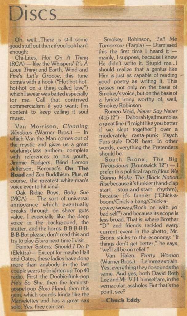 For the longest time (until I came across an even older one), I assumed this was the first singles roundup I ever wrote – for my college paper, senior year at University of Missouri-Columbia. Callow and corny, but my once-new wave tastes are already stretching across the map — including to protest rap, months before “The Message.”
