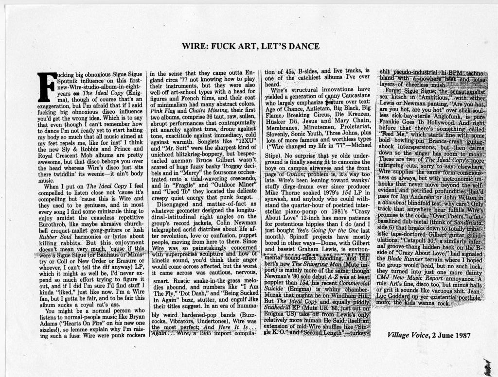 This review got accused of all sorts of things. Homophobia, for one. I still say it was at worst synthophobic (bad enough) if not discophobic, and I still don’t have any use for any Wire records after 154. But that doesn’t necessarily excuse my tossing so many unrelated (and apparently often gay-identified, not that I knew at the time) bands into the same basket. I dunno — If I ever had a “rockist period,” mid-1987 must have been it. Whether I’m at all responsible for Al Jourgensen’s rockist period is worth pondering, but if I wimp-shamed the guy, sorry: Forget industrial metal inspired by Big Black (also namechecked), Ministry had already peaked in ‘86, with their Adrian Sherwooded Twitch. As for Wire, does anybody not believe they peaked in the ‘70s?